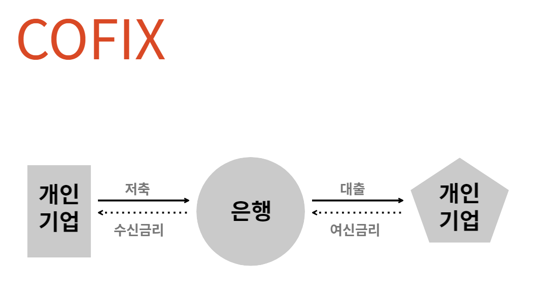 ※ COFIX(코픽스) : 8개의 은행(국민·신한·우리·KEB하나·농협·기업·SC제일·씨티)의 수신상품 자금의 평균 비용을 산출한 것으로, 개인(단체)이 은행에 맡긴 저축을 은행은 모아서 필요로 하는 이에게 대출을 해줍니다. 이때 원금과 이자를 돌려받고, 저축은 개인(단체)에 원금과 이자를 돌려줘야 되니 이것을 고려하여 결정 되는 것이 코픽스 입니다.